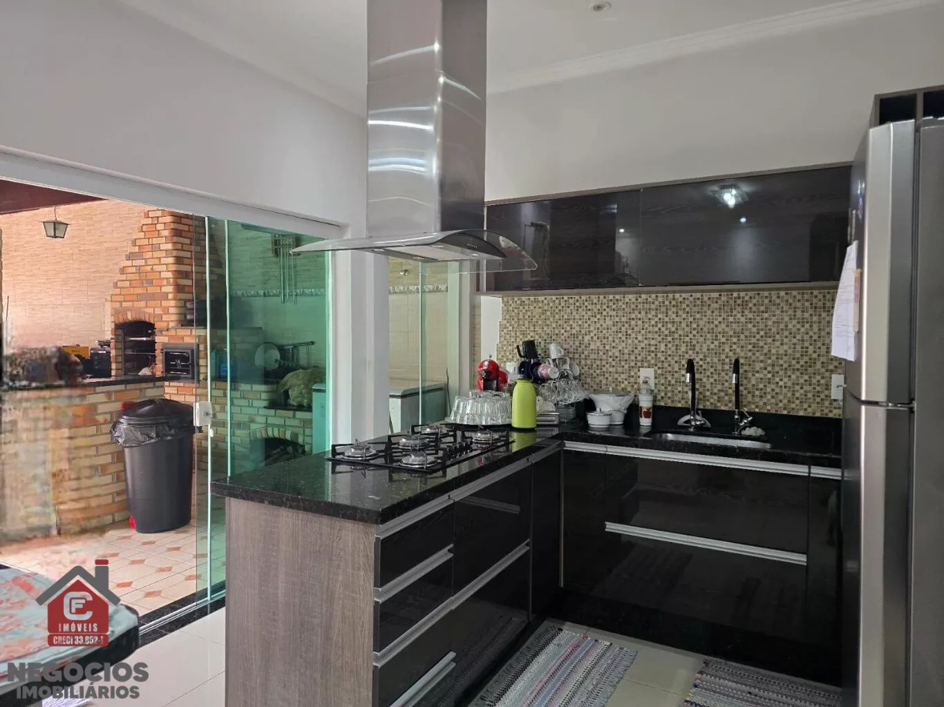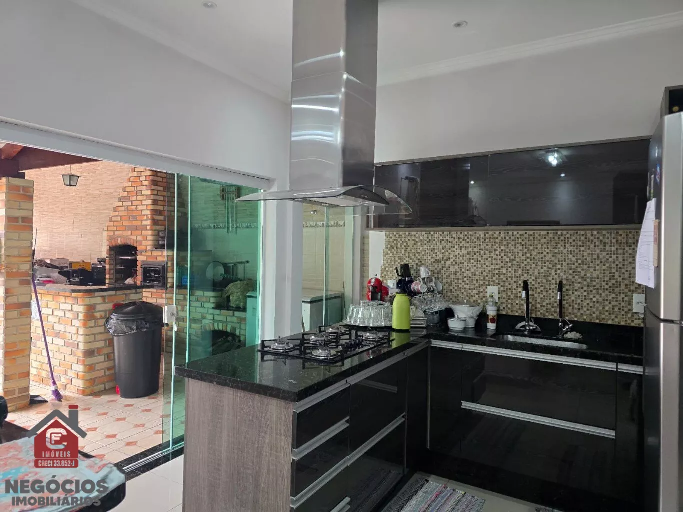 Área gourmet com churrasqueira e fogão à lenha
